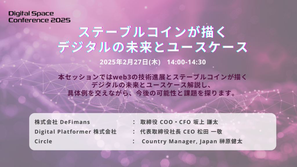 一般社団法人日本デジタル空間経済連盟(所在地:東京都港区、代表理事:北尾 吉孝、以下「連盟」)主催の大規模カンファレンスイベント「Digital Space Conference 2025」にて、株式会社DeFimans 取締役 COO・CFO 坂上 謙太が「ステーブルコインが描くデジタルの未来とユースケース」をテーマに登壇をいたします。