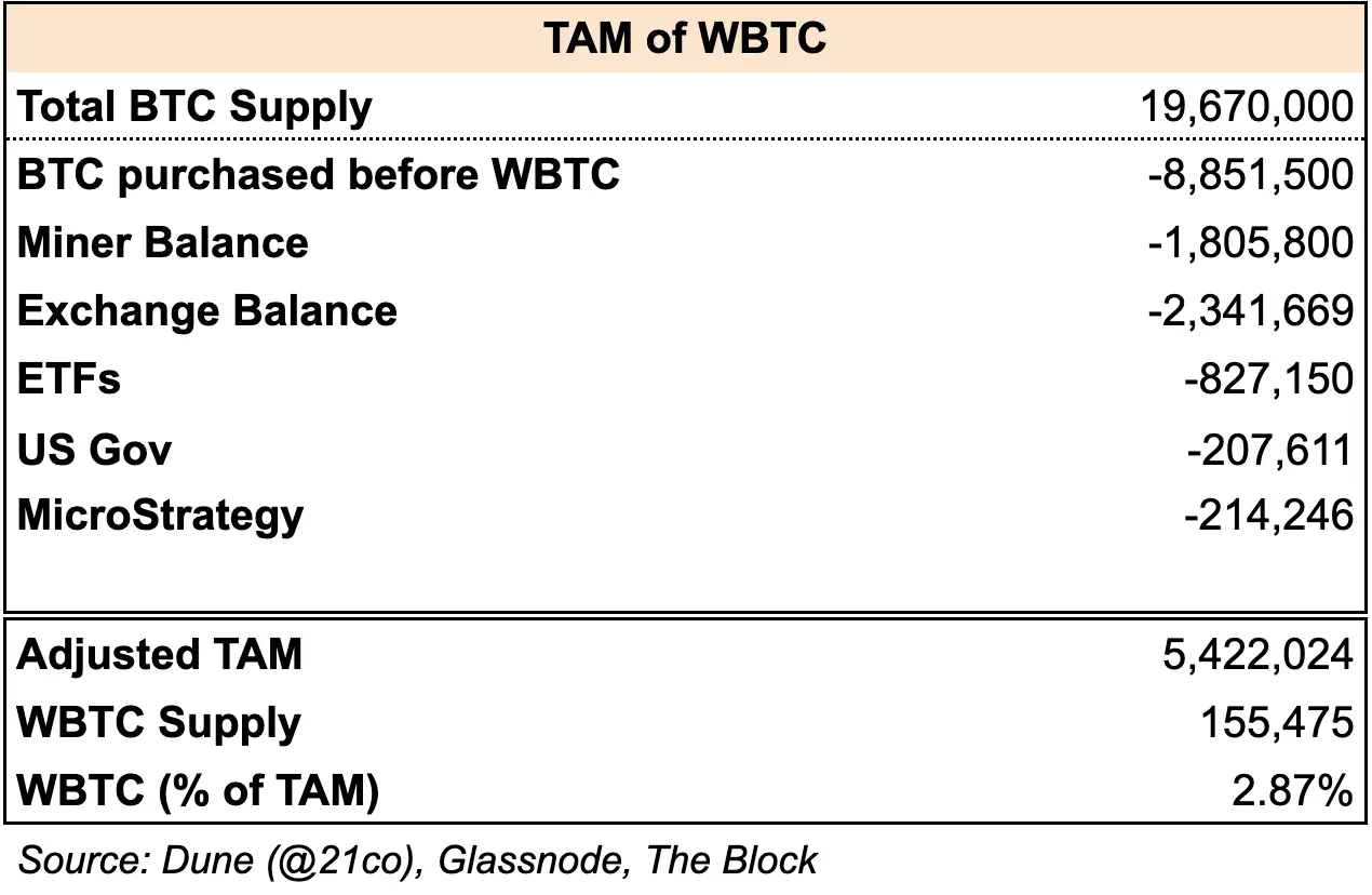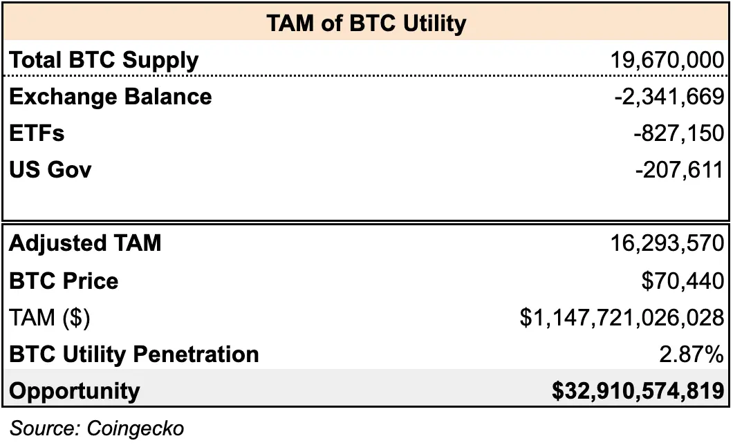 ビットコインベースのエコシステムを批判する人たちは、BTCユーティリティに対する需要が鈍いことの証拠として、BTC供給量の約0.8%を占めるイーサリアム上のWBTCの使用レベルの低さを挙げることが多いです。しかし、この見方はWBTCとBTCを同一の資産として不正確に同一視しており、それによってそれぞれのポテンシャル市場(TAM)の判断を誤っています。WBTCのTAMは本質的に小さくなります。これは、BTCの長期保有者が税金への影響を理由にラップされたトークンに変換することをためらうためです。また、取引所やグレイスケールのような機関は、BTCを直接保有することを好みます。これらの要因を考慮すると、WBTCのTAMは、BTC供給全体ではなく、540万BTCに近くなります。この調整されたTAMを使用しても、WBTCの普及率は3%未満にとどまります。しかし、ラップされたBTCとは対照的に、ネイティブBTCユーティリティ向けに調整されたTAMに同様のレベルの普及率(約3%)を適用すると、ビットコイン開発者による獲得を待っている約320億ドルの潜在的価値が暗示されます。