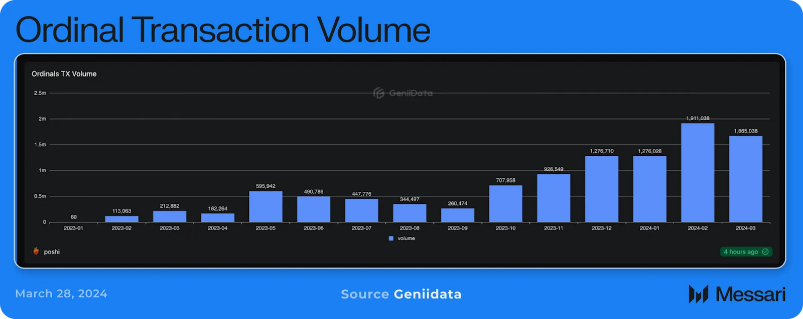 現在、Bitcoin Ordinalsは月間100万〜200万件ものトランザクションを処理しており、多くのL1およびL2プラットフォームに匹敵する規模に成長しています。