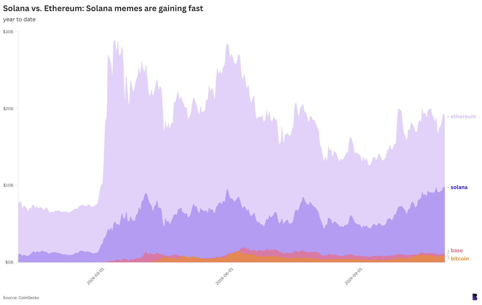 注目すべきは、Bitcoinが3月にピークを付けた際のレベルからEthereumのミームコインが35%も下落し停滞を続ける一方で、Solanaのミームコインは今なお勢いを増している点だ。