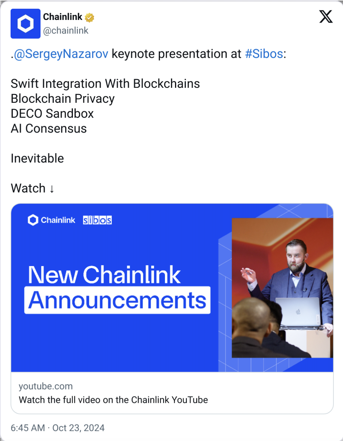 Chainlinkの共同創設者であるSergey Nazarov氏は、中国の北京で開催されたSwift主催のSibos会議での講演で、この統合がもたらす実用的な利点を強調しました。