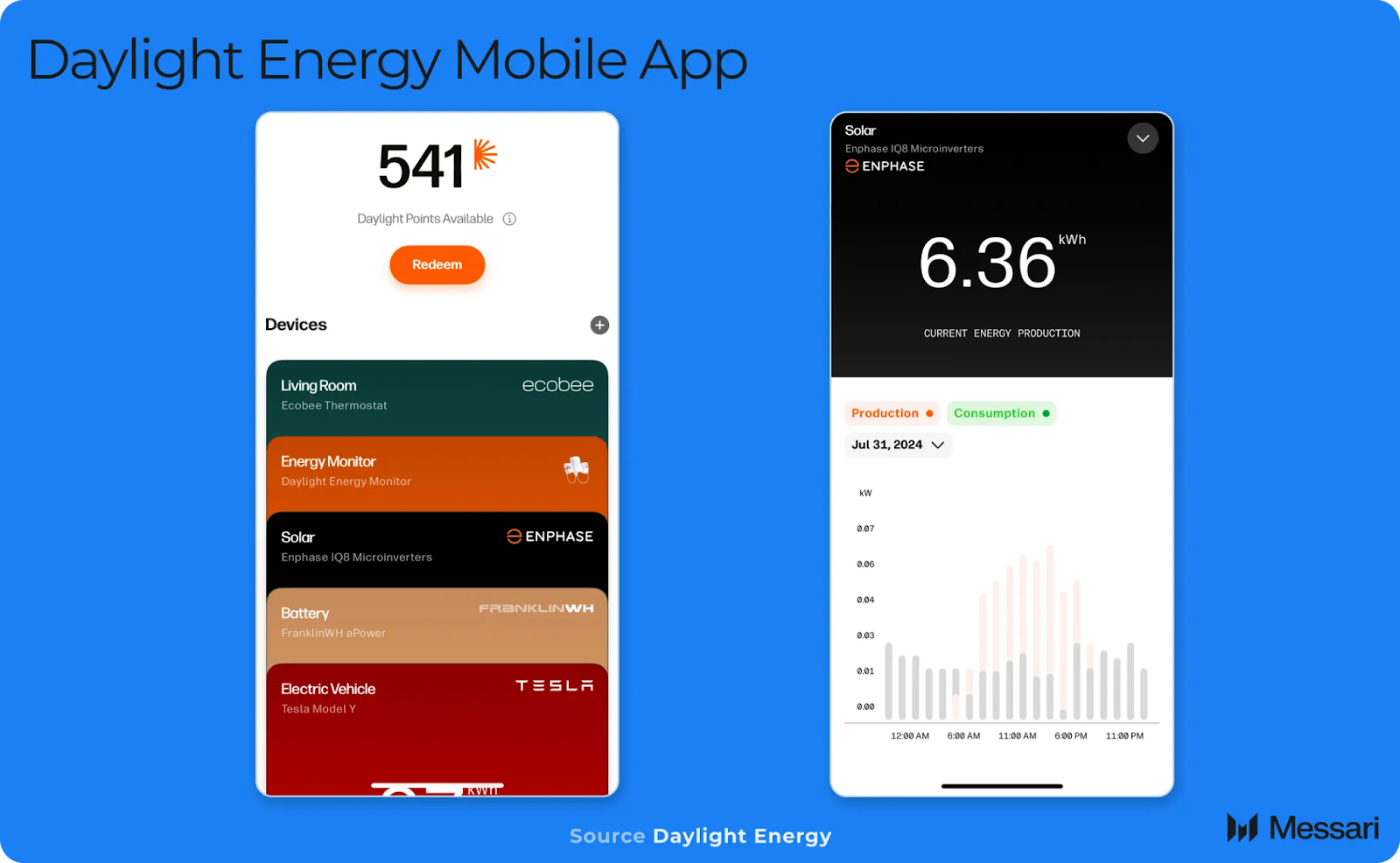 もう一つの新興VPPはDaylight Energyで、住宅所有者がエネルギーコストを節約し、クリーンエネルギーに移行するのを支援する一連の製品とサービスを提供しています。Daylightのユーザーは、さまざまなセンサーやモニターを通じてエネルギーとエネルギー使用に関するデータを寄与し、その見返りとしてDaylightポイントを受け取ります。このポイントは、報酬と交換することができます。Dawn とともに、Daylight は DePIN プロトコルとトークンエコノミー設計に Medallions を導入する予定です。Base 上の L3 として構築された Daylight は、2024年7月に a16z Crypto が主導する900万ドルのシリーズAを調達しました。