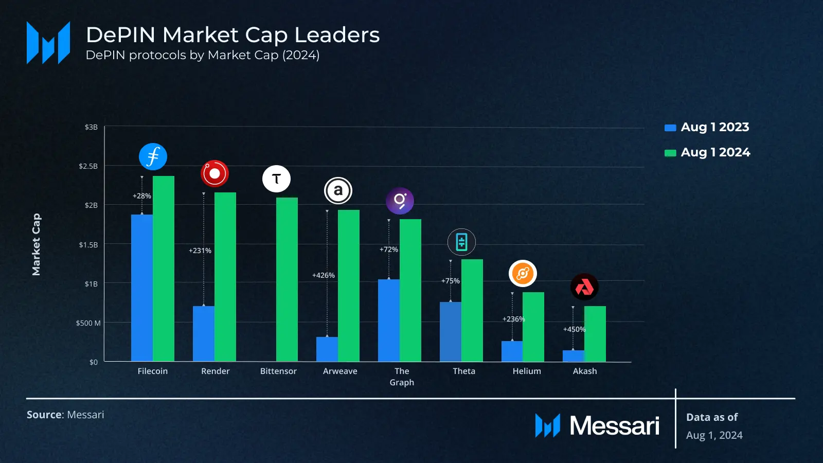 上位のDePINプロトコルは、昨年大幅に成長しました。Render(231%増)、Arweave(426%増)、Helium(236%増)、Akash(450%増)はいずれも前年比で200%以上の成長を遂げました。