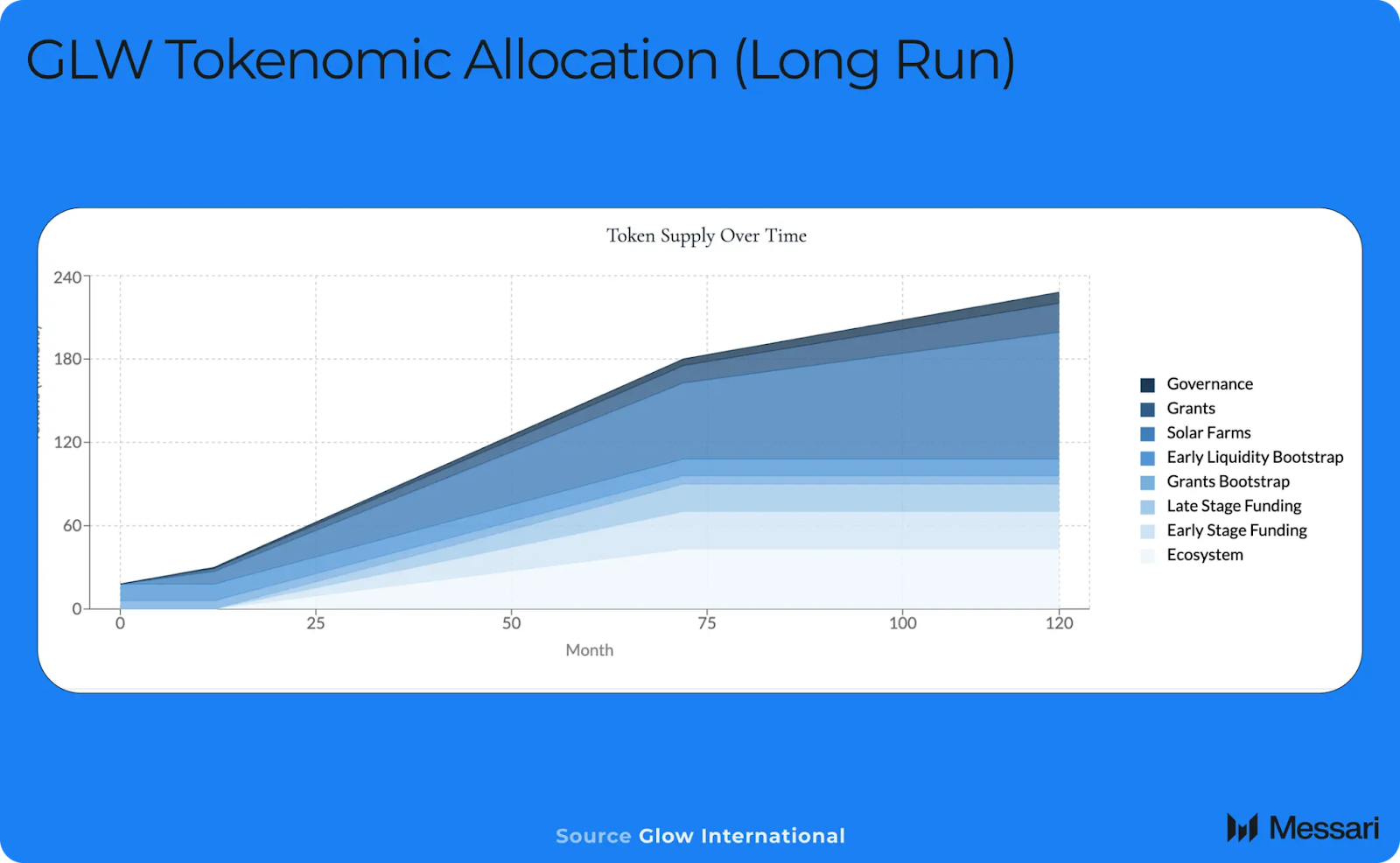 合計230,000 GLWトークンが毎週分配され、年間で1200万トークン弱のインフレとなります。 Bitcoinとは異なり、GLWには供給上限がありません。 この設計上の選択は、初期の投資家から長期的にソーラーファームにGLWを割り当てることを目的としています。