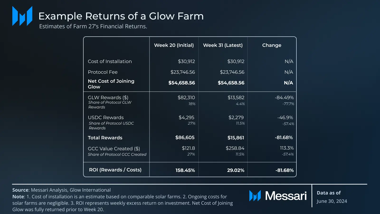 第31週の報酬では、ファーム27は7,730 GLW(13,582ドル)のトークンと2,279ドルのUSDC報酬を受け取りました。ファーム27は第31週に15,861ドルの報酬を受け取り、その週の初期投資に対して約29.02%のリターンを得ました。依然として高いリターンではあるものの、ファーム27は11週前の6分の1に近いリターンしか得られませんでした。これは、Glowに参加したソーラーファームが数十社に上り、報酬プールを活用したためです。ファーム27は、実際にはカーボンクレジットの生産量を2倍にし、第27週には0.32のカーボンクレジットを生産しましたが、受け取った報酬は少なくなりました。これは主に、ファーム27が貢献したUSDCで1位から8位に順位を下げたことが原因です。ファーム27は、ネットワークGLW報酬の18%を受け取っていたのが4.4%になり、週ごとのGCC生産量も27%から11.5%に減少しました。