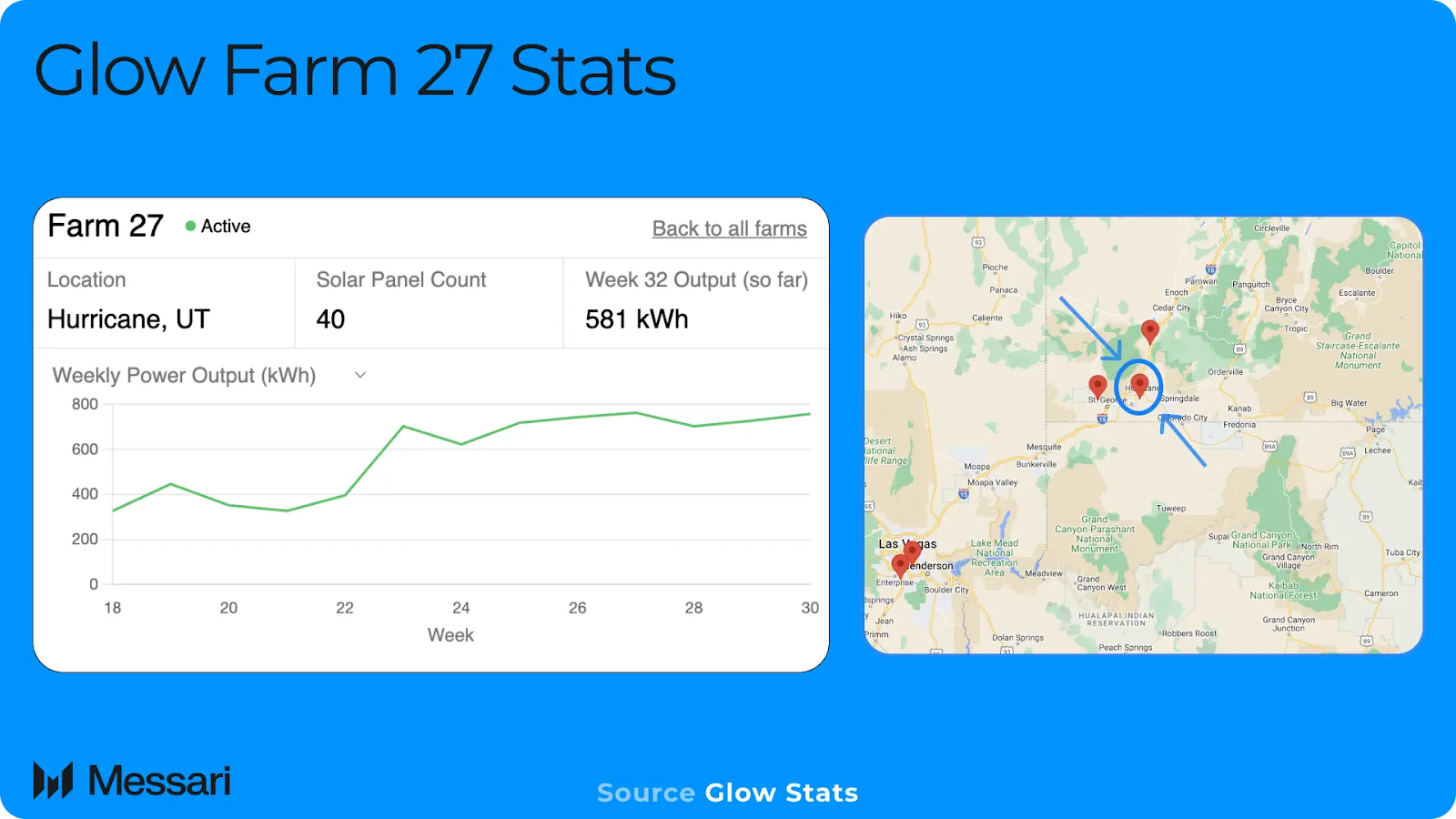 ユタ州ハリケーンにある Glow ファーム27の実際の例を見てみましょう。ファーム27は、23,746ドルのプロトコル料金を前払いし、Glow用に40枚のソーラーパネルを設置しました。ファーム27は、1週間に平均約700kWhの電力を発電しています。正確な設置費用は不明ですが、類似のソーラーファームを基に費用を推定することができます。