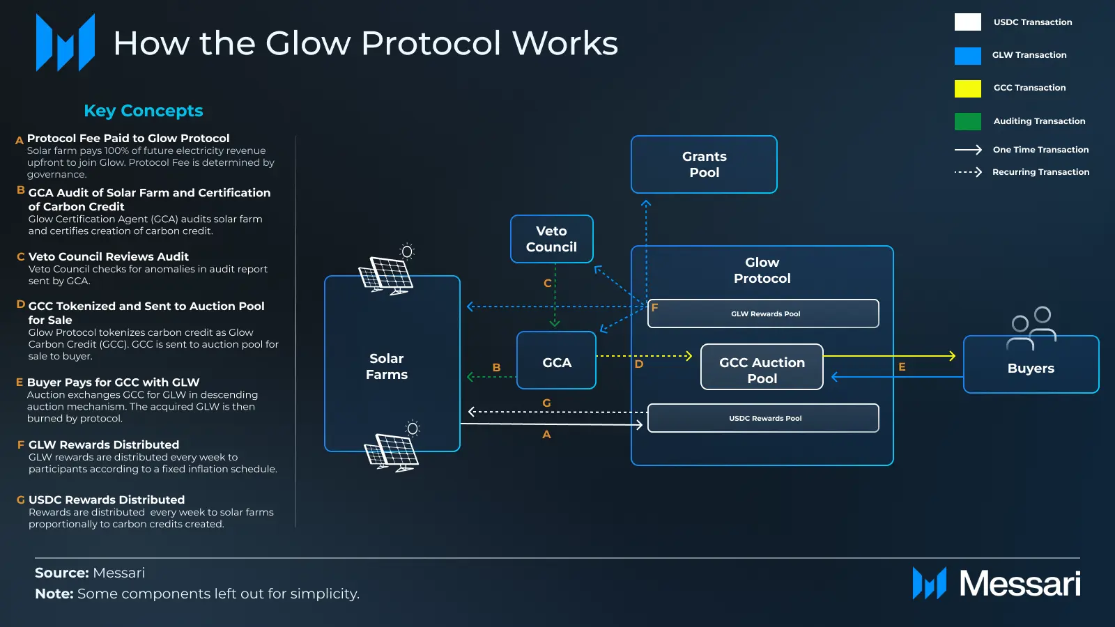 G. Glowプロトコルは、競争モデルを使用して、特定の週に作成されたカーボンクレジット(GCCトークン)の数に基づいて、ソーラーファームに報酬プールからUSDCを比例配分します。