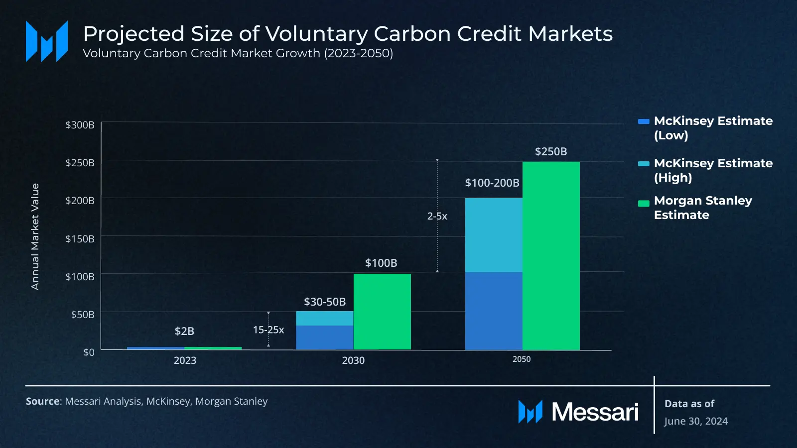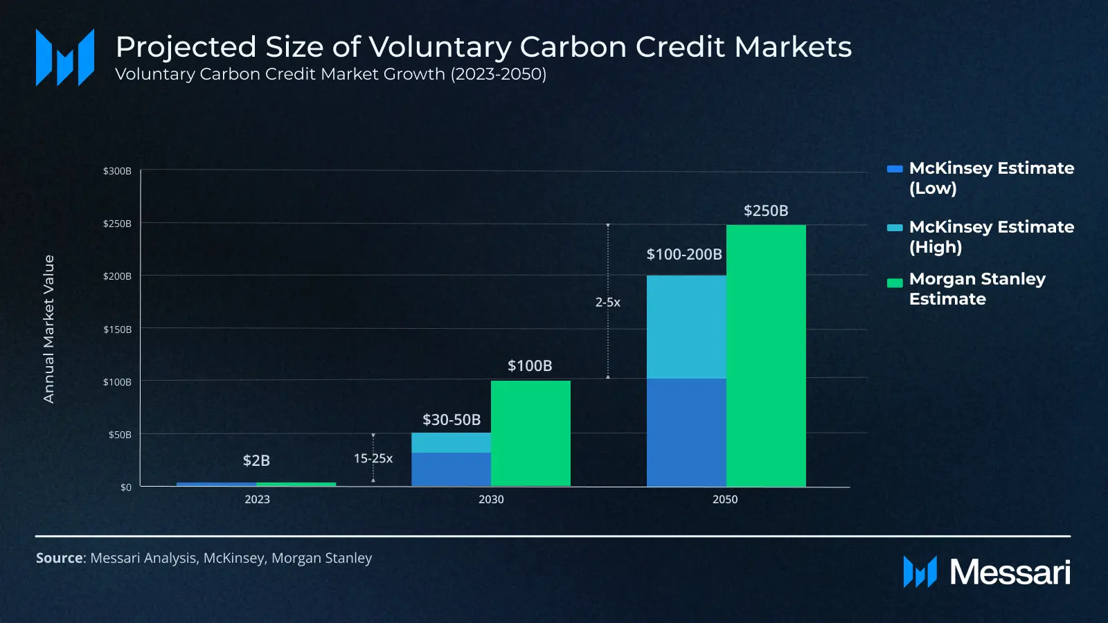 2022年には、自主的なカーボンクレジット市場は年間20億ドルの規模でした。モルガン・スタンレーは、自主的な市場は2030年までに1000億ドル(50倍増)、2050年までに2500億ドル(125倍増)に成長すると予測しています。マッキンゼーは、2030年までに15倍から25倍の300億ドルから500億ドル、2050年までに100倍の2000億ドルを超える規模に成長すると予測しています。これらの予測は、2030年までに年間15億トンから20億トン、2050年までに年間70億トンから130億トンに増加するカーボンクレジットの需要に基づいています。