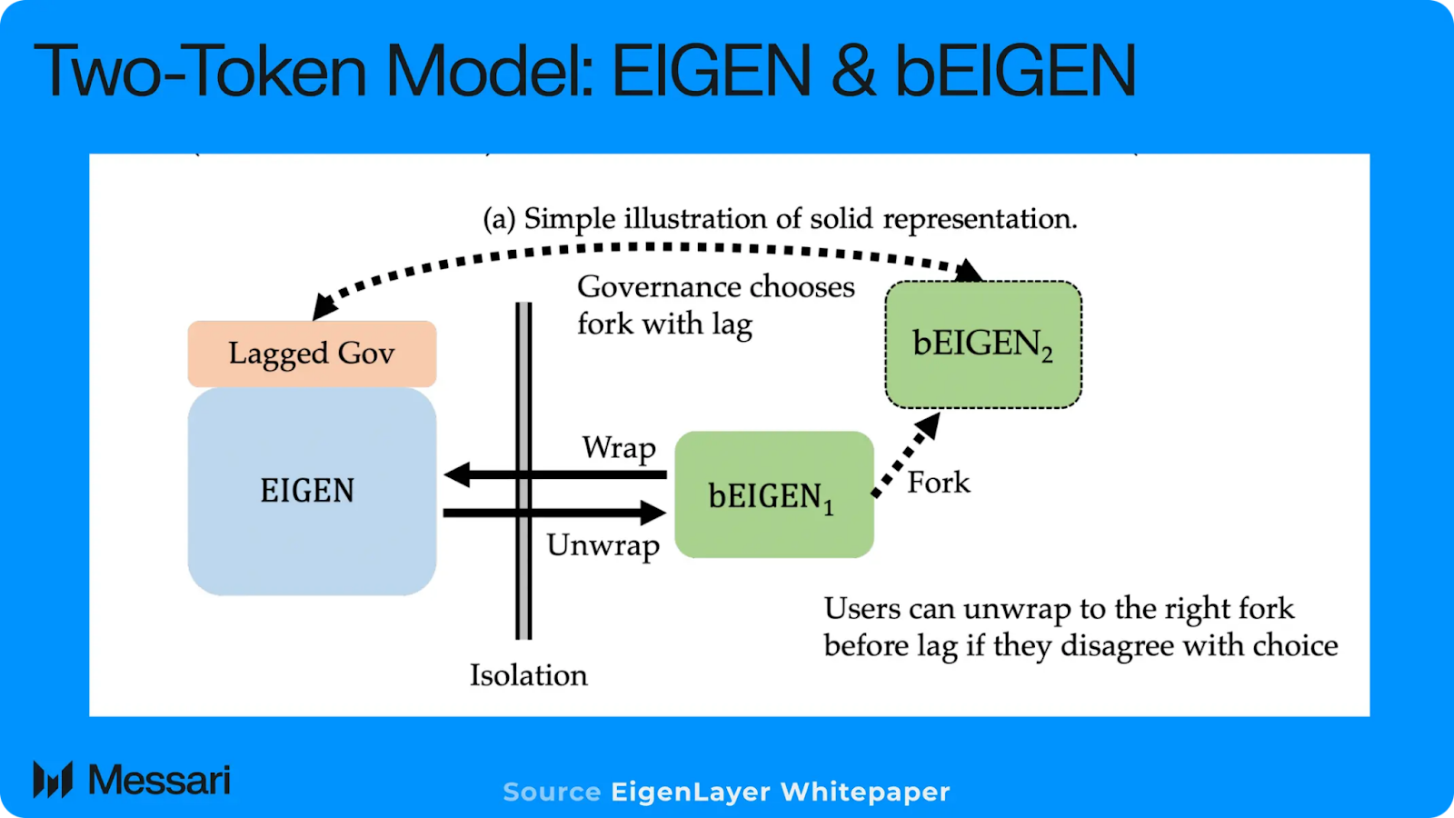常にフォークを繰り返すトークンによって発生する問題は容易に想像できるでしょう、EIGENトークンを保有するDeFiプロトコルや取引所にどのような影響があるのでしょうか。従来であれば、トークンの最新バージョンを継続的にサポートする難しい作業の責任はユーザー、プロトコル、取引所にありました。これを解決するために、EigenLayerは2つのトークンシステムを採用しています。