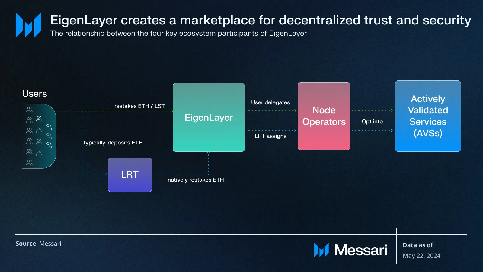 - リキッド・レステーキング・プロトコル(LRT):これらのプロトコルは、ユーザーから預かった資産を集約し、自身のオペレーターや他のオペレーターに委任することで、他のエコシステム参加者を補完します。EignLayerが当初成長したのは、LST預金の上限がないネイティブステークがあったためです。EigenLayerは現在LST預金の上限を設けていませんが、LRTプロトコルは、ユーザーに代わってオペレーターの戦略を管理することで、将来的により大きな役割を果たすものと位置付けられています。