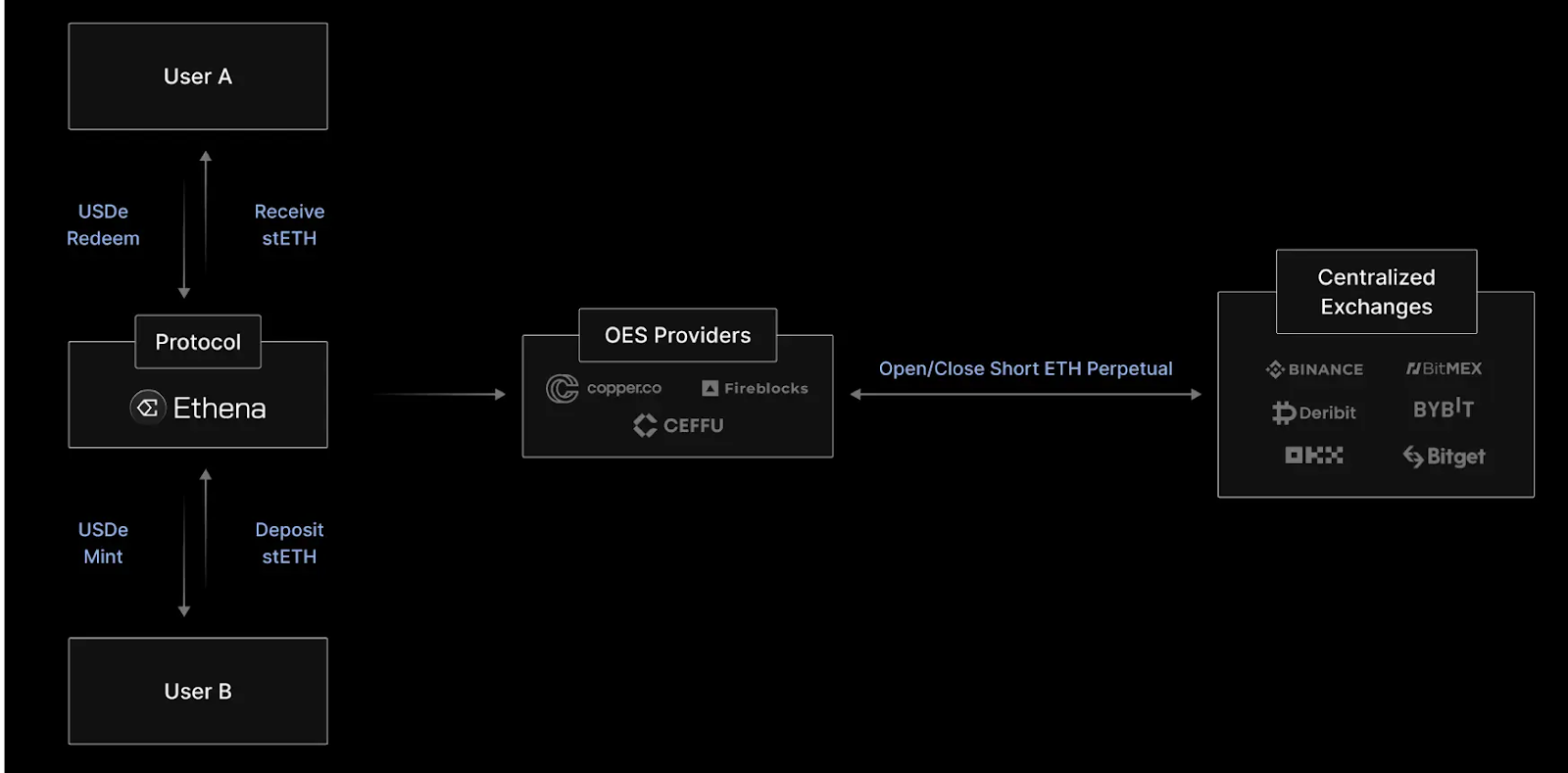 ユーザーはstETHをEthenaプロトコルに預け入れ、1:1の比率でUSDeをミントします。預け入れられたstETHは、第三者保管機関に送られ、「取引所外決済」を通じて中央集権型取引所で担保を維持します。その後、EthenaはCEXでショートETHのパーペチュアルポジションを開設し、担保価値がドル建てでデルタニュートラルまたは一定に保たれるようにします。その後、このポジションから得られるファンディングレート(先物価格と現物価格の乖離を調整するために、先物取引のロングポジションとショートポジション間で支払われる手数料)の金利収入がUSDeのステーカーに支払われ、ETHのキャリートレードが実質的にトークン化されます。