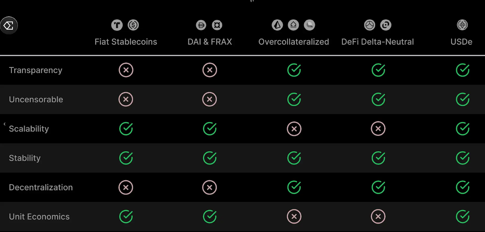 理想的なステーブルコインとは、中央集権型と非中央集権型の両方の長所を兼ね備え、透明性、検閲耐性、スケーラビリティ、安定性を提供するものです。2月19日に公開されたEthenaは、独自の仕組みを持つ潜在的なソリューションとして位置づけられています。