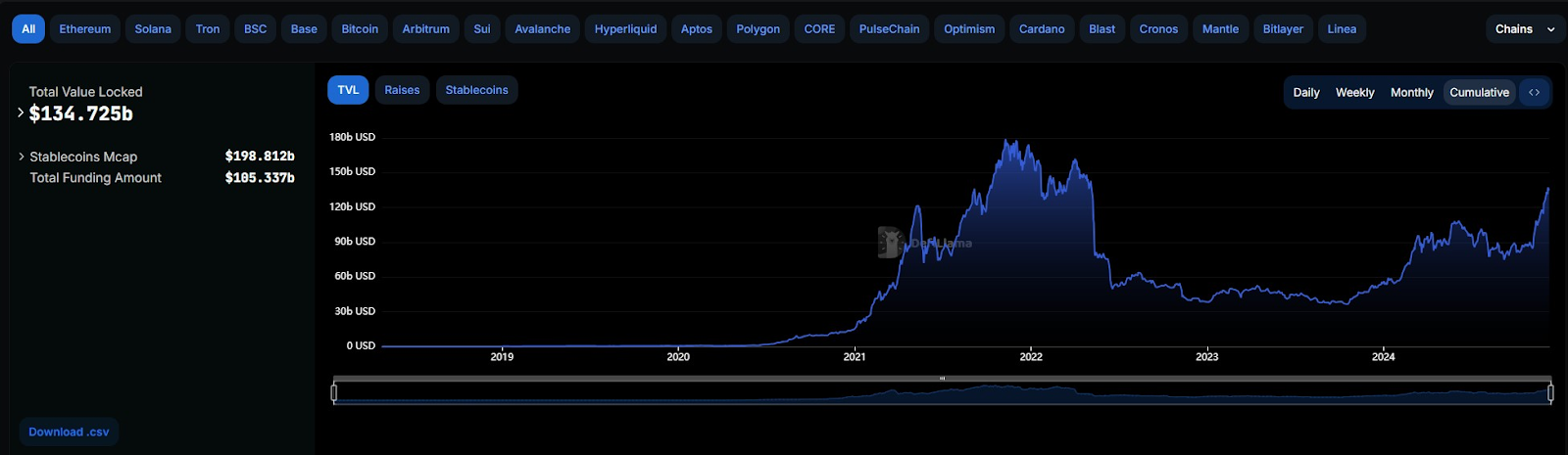 分散型金融(DeFi)のエコシステムにおける総ロック額(TVL)が、DefiLlamaのデータによると、2021年以来の最高値に近づいています。