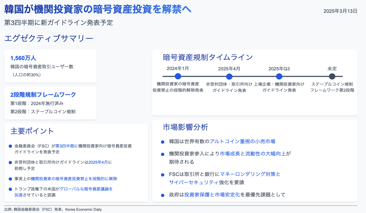 今回の詳細なガイドライン発表の計画は、韓国が暗号資産資産への厳格な規制方針から転換し、暗号資産市場への関与を容認する方向へシフトしていることを明確に示している。