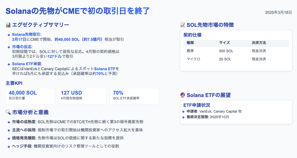 2月、CMEは2種類のSOL先物契約を上場する計画を発表した。標準契約は500 SOL、小口投資家向けの「マイクロ」契約は25 SOL単位で行われる。