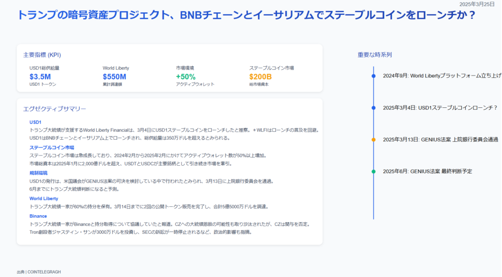 USD1ステーブルコインの発行は、米国議員が「Guiding and Establishing National Innovation for US Stablecoins(GENIUS)法案」の可決を検討している中で行われたとみられている。この法案は3月13日に上院銀行委員会を通過し、近日中に本会議で採決される予定である。