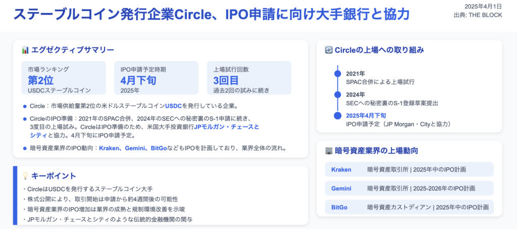 ・Circleは以前、2021年のSPAC合併と2024年のSECへの秘密裏の申請を通じてIPOを試みたことがある。