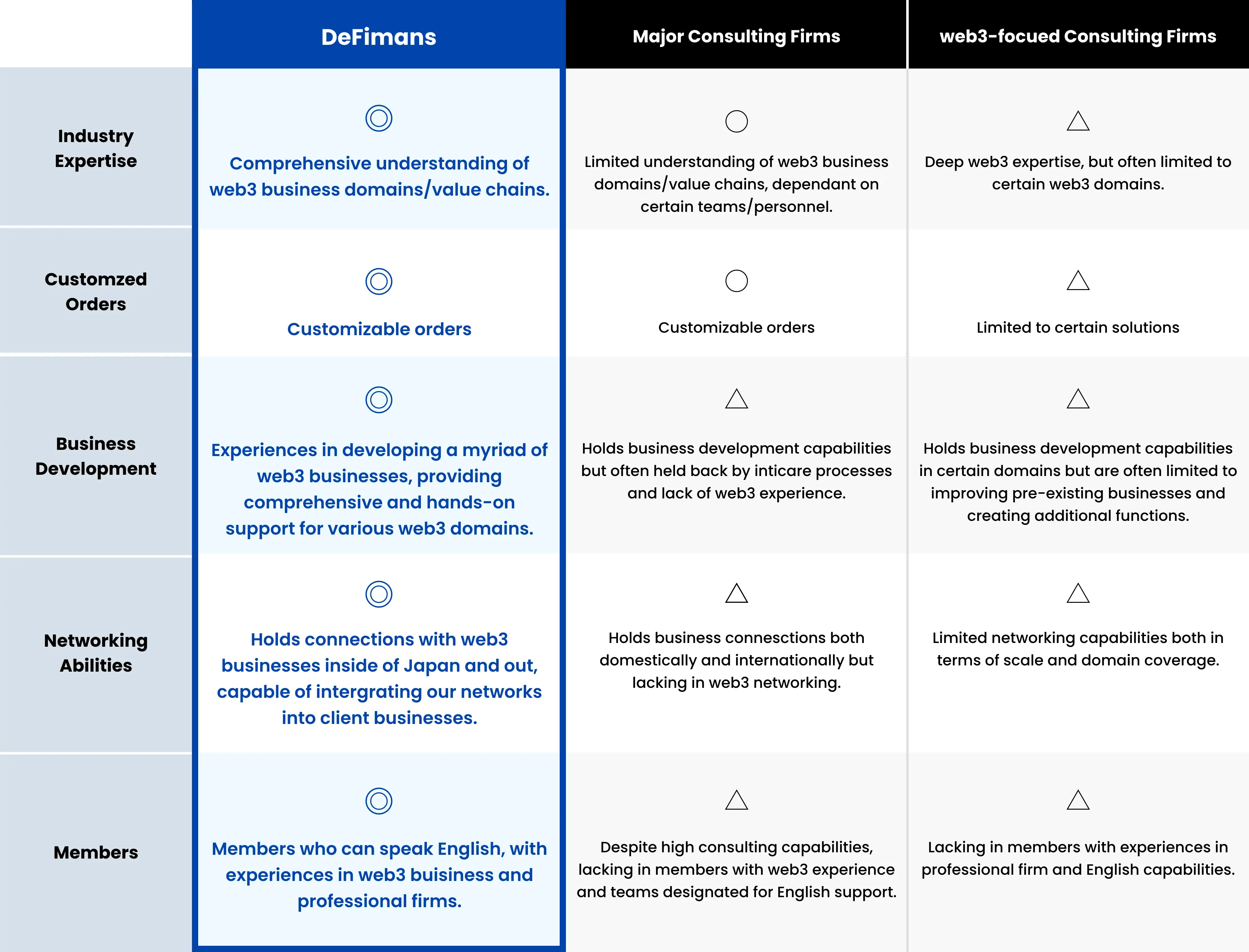 DeFimans specializes in token economics, token finance strategies, blockchain gaming, DeFi, international business expansion, and social implementation of blockchain businesses. We provide hands-on support for numerous web3 projects, including several companies listed on the Japanese stock exchange. Our team is composed of experts experienced in web3 business development, entrepreneurship, and professional consulting firms and are skilled in strategy, technology, content, structured products, macroeconomics, and finance.
